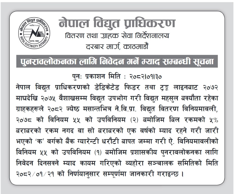 • Public notice regarding the deadline for review of customers who have outstanding tariff dues after consuming electricity from dedicated and trunk lines.