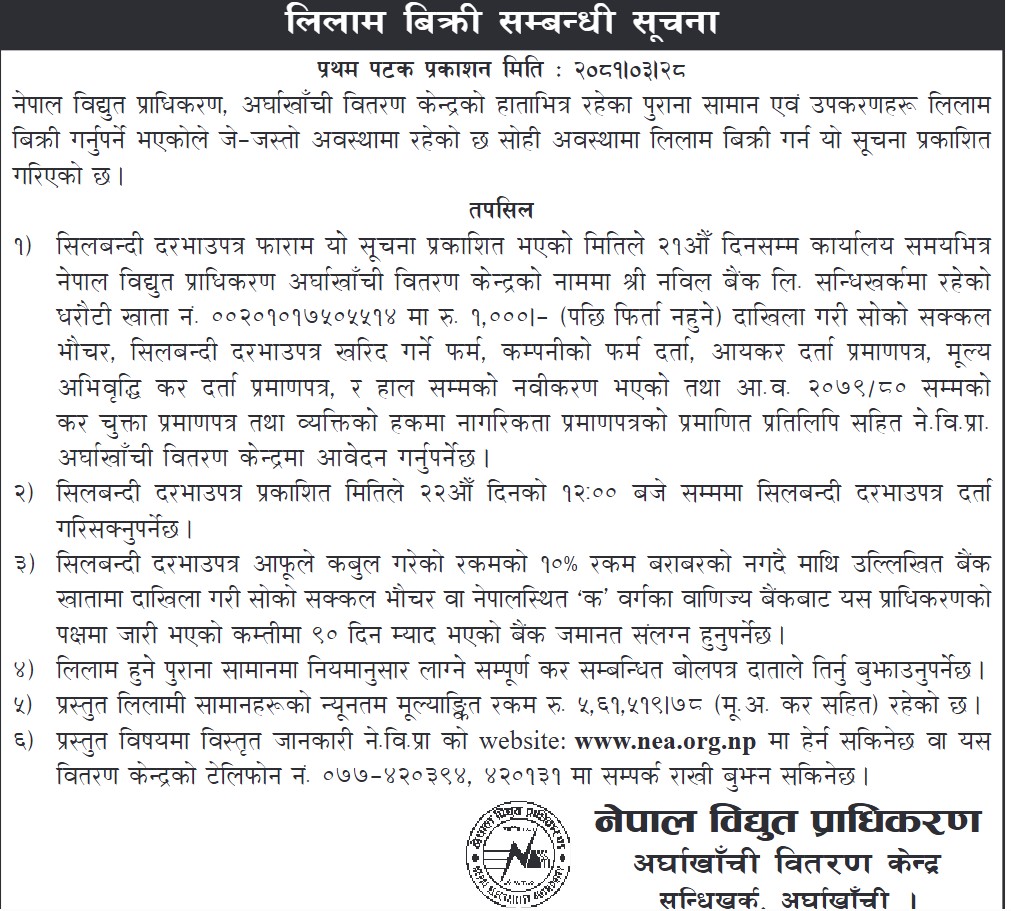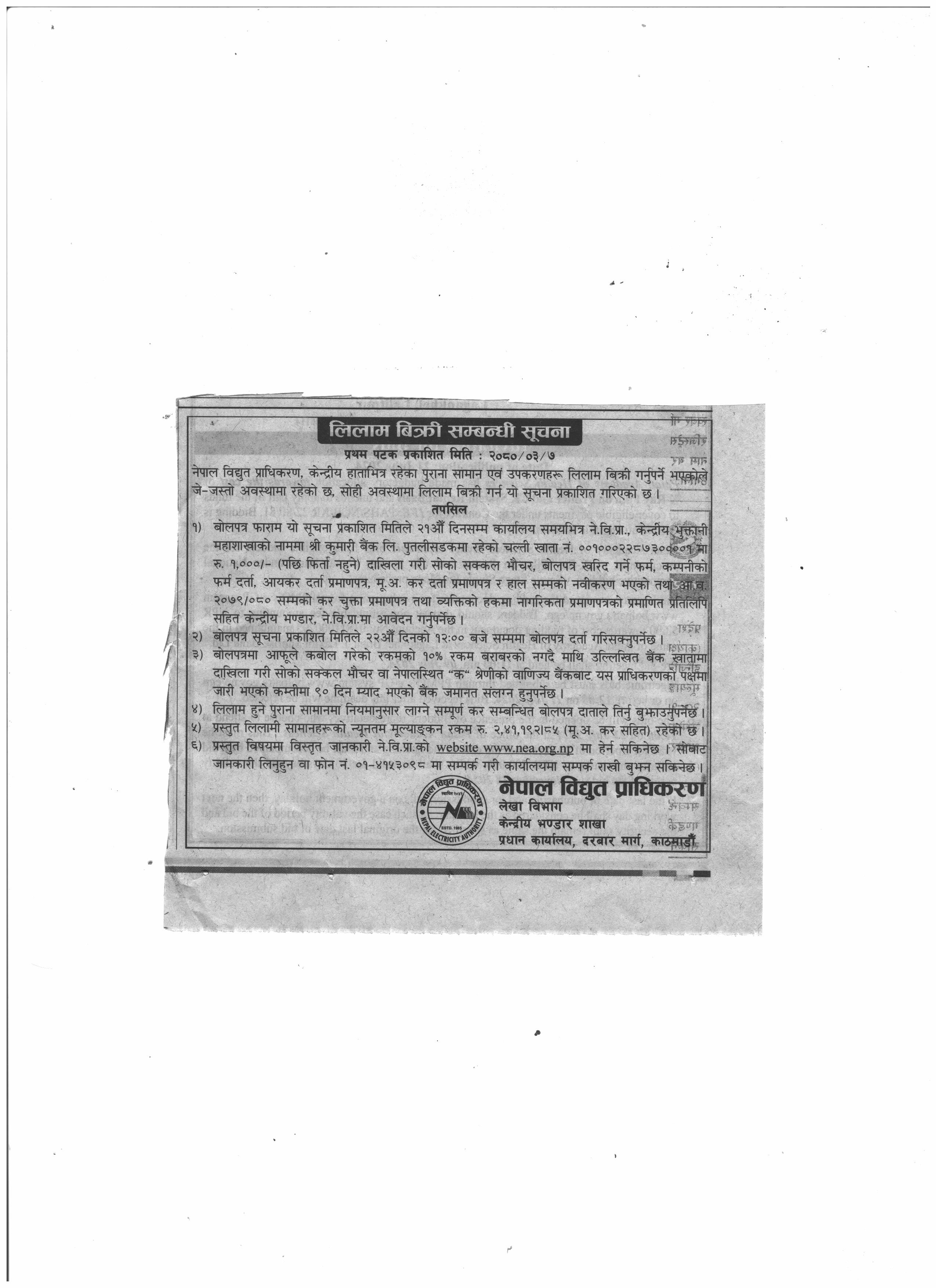 Nepal Electricity AuthorityAccounts DepartmentCentral Warehouse BranchHead Office, Durbar Marg, Kathmandu