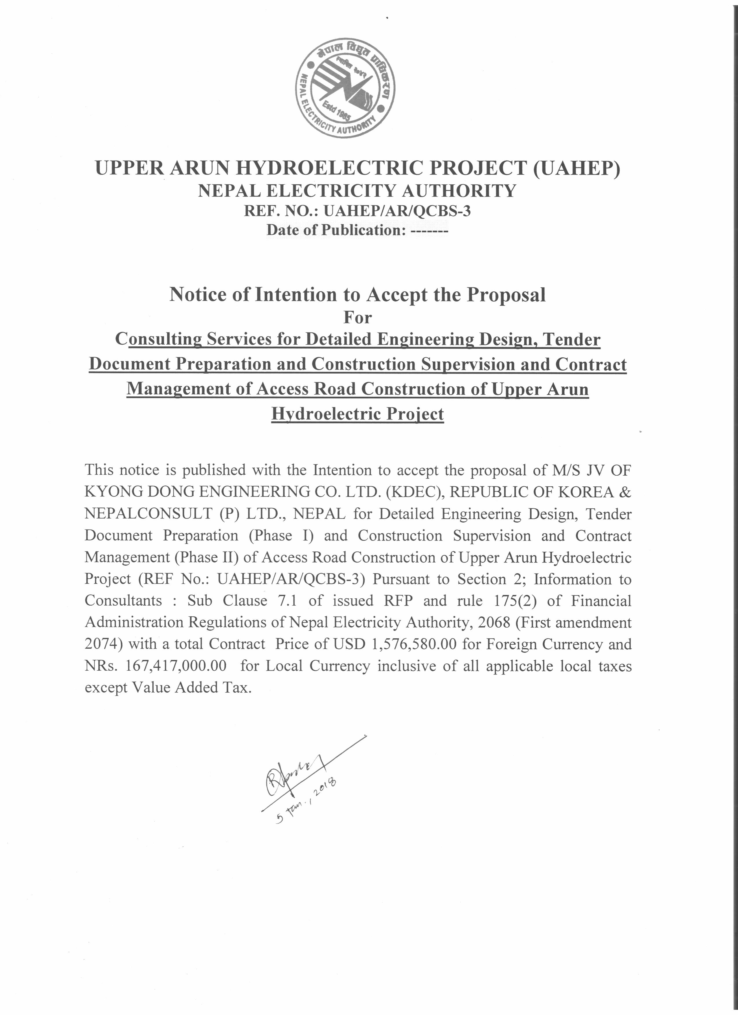 | 61 | UAHEP-AR-QCBS-3 | Detailed Engineering Design, Tender Document Preparation, and Construction Supervision and Contract Management of Access Road Construction for Upper Arun Hydroelectric Project | M/S JV OF KYONG DONG Engineering Co. Ltd. Republic of Korea and NEPAL Consult Pvt. Ltd. NEPAL | 0 |