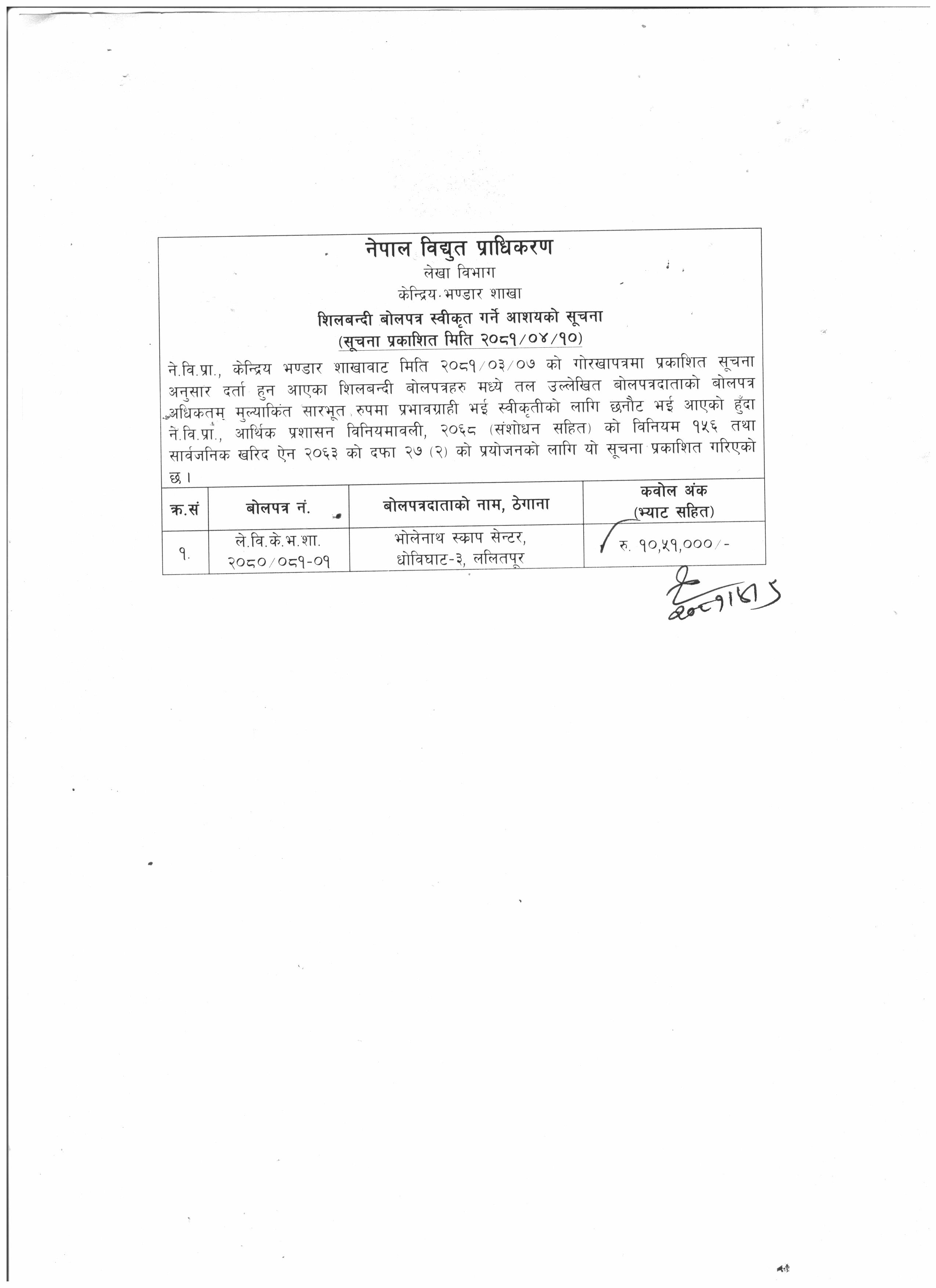 14 ले. बि. के. भ. शा. २०८०/८१-०१ सिलबन्दी दरभाउपत्र स्विकृत गर्ने आशयको सूचना केन्द्रीय भण्डार शाखा