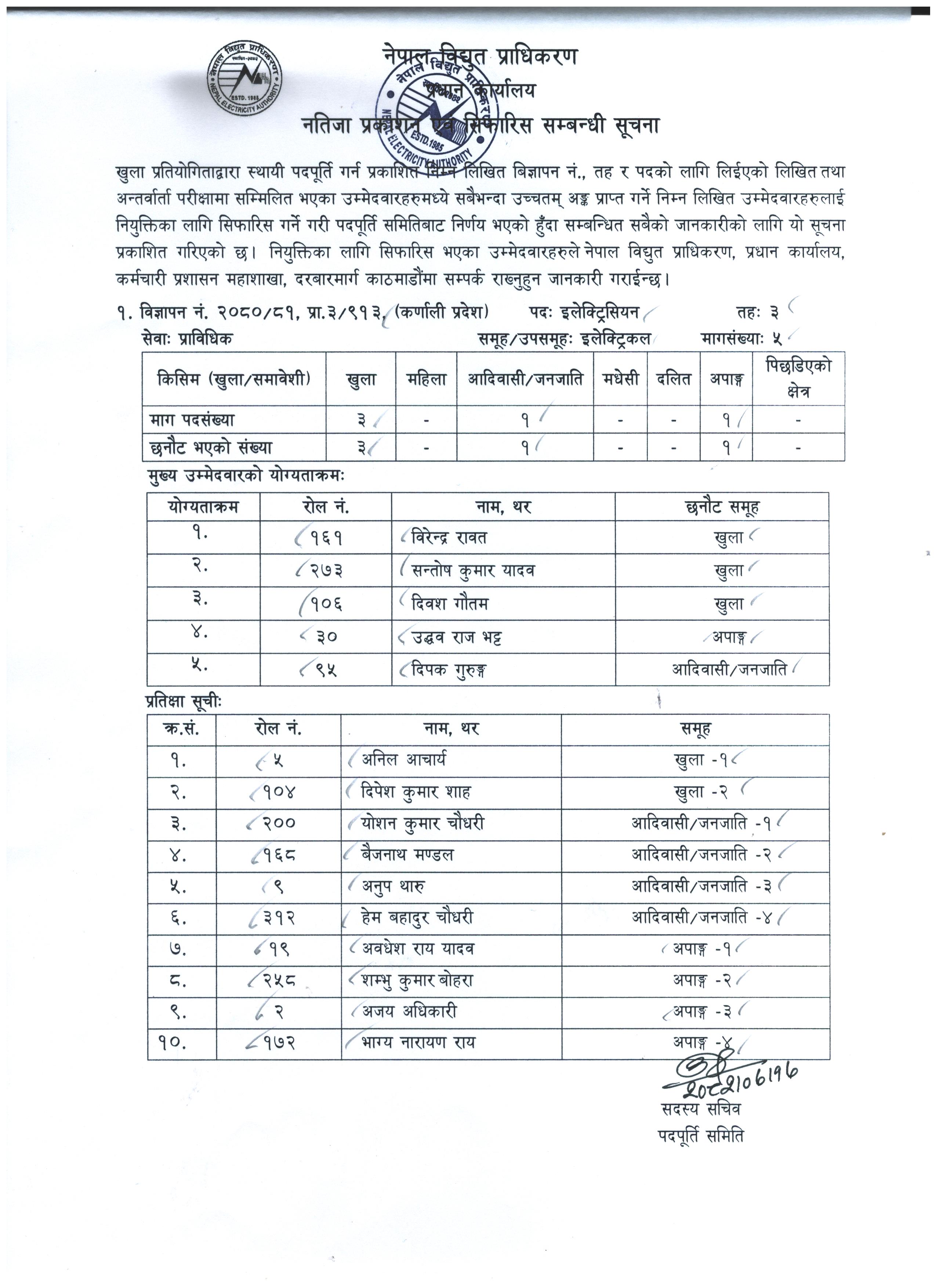 Publication of the final results of the written and interview examination for the open competition for the post of Level 3, Electrician as per the advertisement published on 2080.07.24 (2082.07.17)